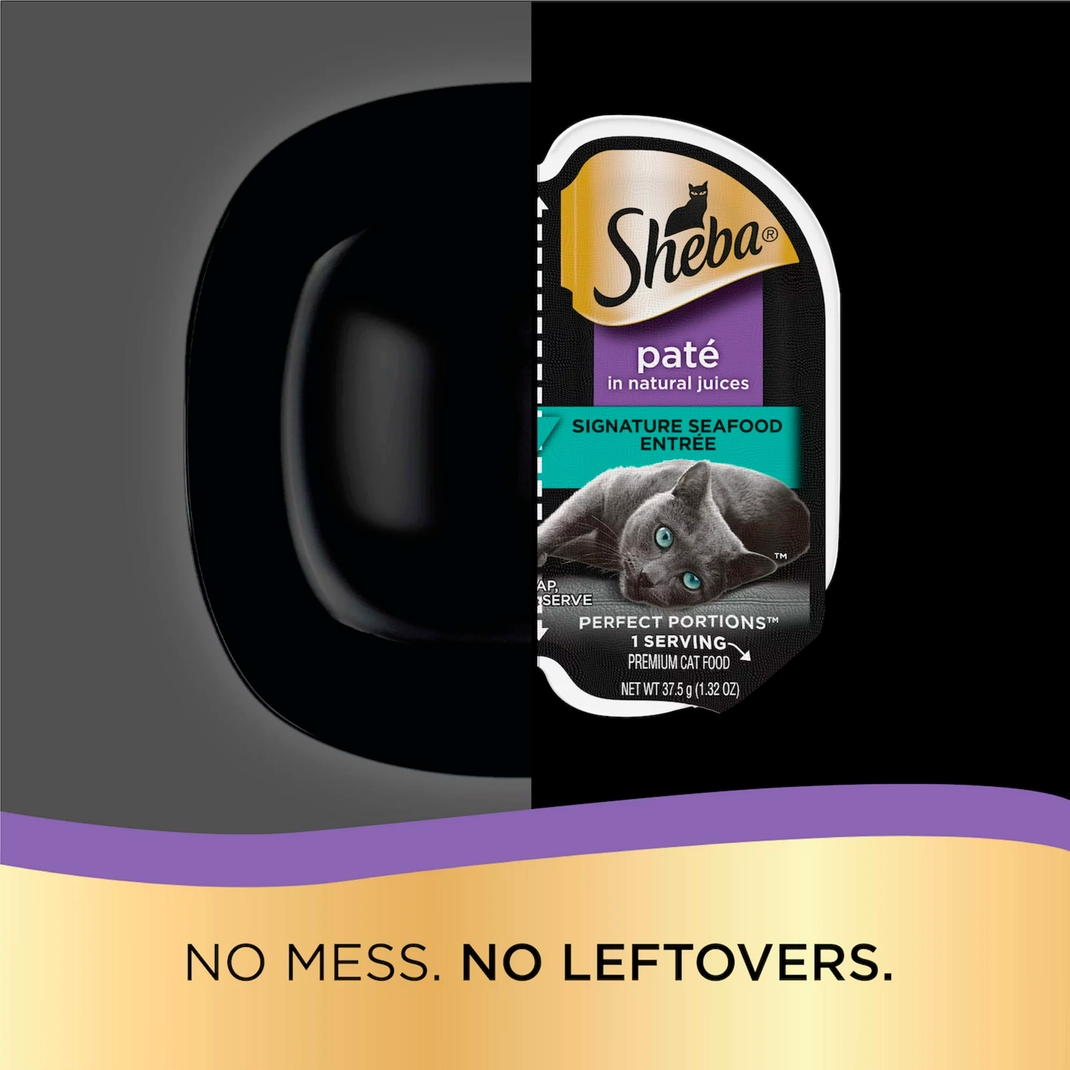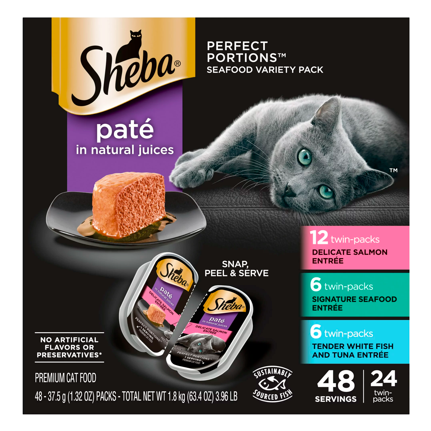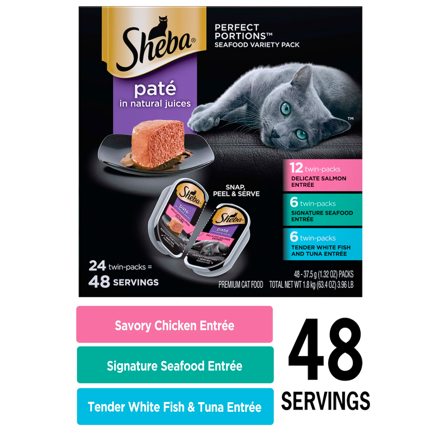 SHEBA Wet Cat Food Pate Variety Pack, Signature Seafood, Delicate Salmon and Tender Whitefish & Tuna Entrees, 2.6 oz. PERFECT PORTIONS Twin-Pack Trays